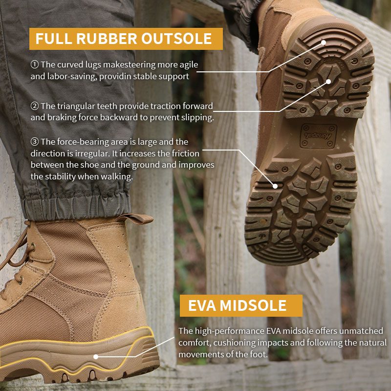 Taktické boty Cordura Fabric Desert, navržené pro nejtěžší terén, poskytují lehké pohodlí a vážnou stabilitu – takže se můžete s jistotou pohybovat po skále, písku a všem mezi tím. Svršek z Cordury odolá oděru a zadržuje úlomky míli za mílí. Pod nohama vysoce výkonná mezipodešev EVA tlumí každý úder a přirozeně se pohybuje s vaším krokem. A gumová podrážka? Uchopí sypkou půdu i drsné stezky – vyrobeno tak, aby se přizpůsobilo, vyrobené tak, aby vydrželo.