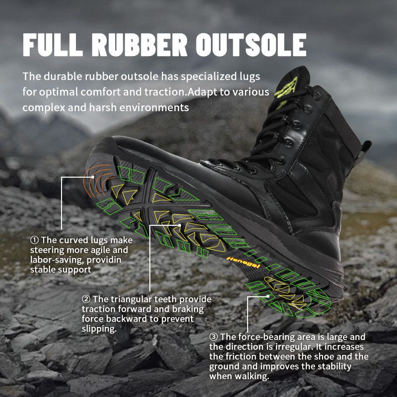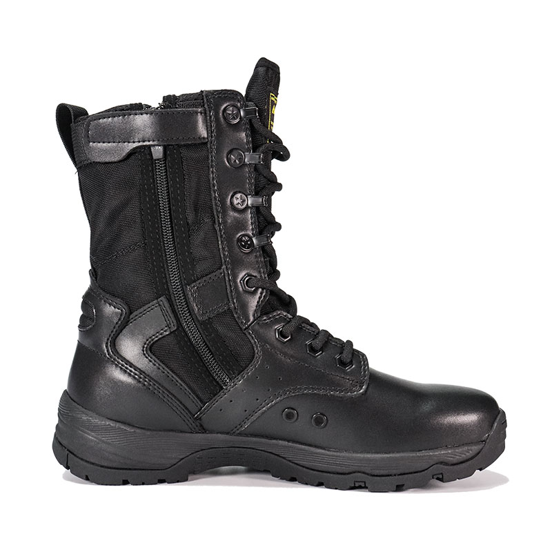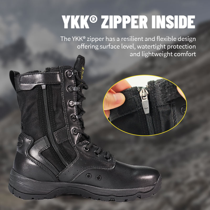 Policejní boty s celogumovou podrážkou, vytvořené pro vojenský personál a outdoorové nadšence, nabízejí pohodlné, obepínající střihy se značnou stabilitou na nerovném terénu. Vyztužený jazyk udržuje nečistoty venku a zůstává uprostřed, zatímco odolný semišový a nylonový svršek odolává náročným podmínkám. Zip YKK usnadňuje nazouvání a vyzouvání, takže se můžete soustředit na misi před vámi.
